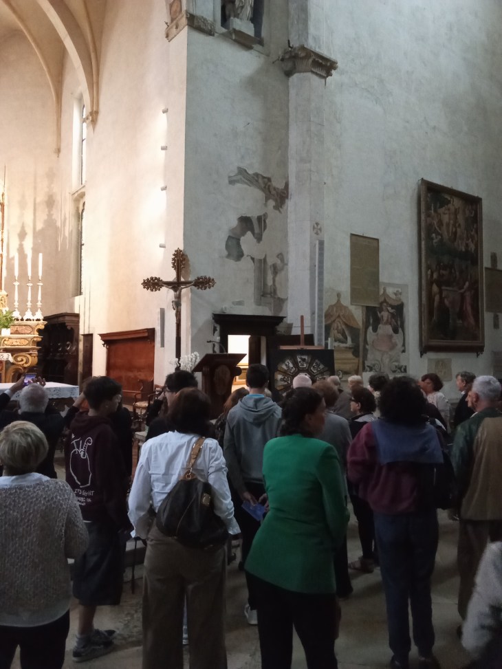 Domenica 4 maggio, un folto gruppo di asolani e turisti si è ritrovato nella sala del Museo per partecipare alla presentazione del Cammino di Santa Giulia, un percorso suggestivo che collega tutte le pievi storiche dedicate alla santa, dalla Corsica fino a Brescia, passando anche per Asola.A seguire, l’intervento Un affetto che si fa strada ha offerto una breve introduzione ai primi Giubilei e alla veronica romana, la reliquia del sudario di Cristo, meta e premio dei pellegrinaggi medievali. Le sue raffigurazioni sono oggi al centro della mostra diffusa La Veronica e la Lombardia.Guidati da Matilde Monteverdi, i partecipanti si sono poi spostati in Cattedrale, dove – grazie anche ai binocoli forniti dal museo – hanno potuto scoprire le veroniche presenti nel presbiterio, nel polittico della Misericordia e nel rosone.